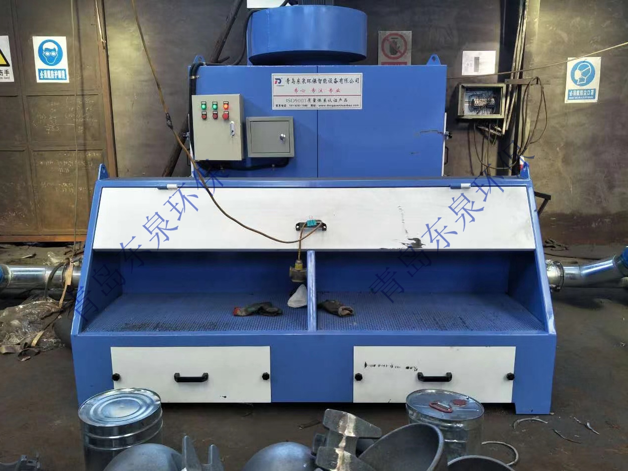 本設備在風機的作用下,含塵氣體從除塵器正面的迷宮式進風窗進入除塵器箱體。粉塵通過迷宮窗慣性碰撞除塵,大顆粒粉塵被碰撞分離,火星被熄滅,粉塵進入第二級濾筒高 效過濾段,含塵氣體由濾筒外表面穿過濾芯,粉塵則被濾芯阻攔在其表面,當被阻攔的粉塵在濾芯表面不斷沉積時,當壓差達到設定值時,壓差傳感器發(fā)出指令,通過脈沖噴吹對濾筒進行逐個清灰,使得沉積在濾芯表面上的粉塵顆粒在壓縮空氣的沖擊下,脫離濾芯表面落入集塵抽屜中,使得整個濾芯表面都得到清潔,凈化后的空氣經風機排出。