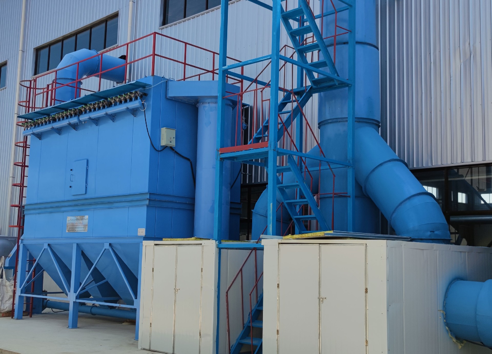 電爐除塵器裝置系統(tǒng)為:將來自工業(yè)硅生產(chǎn)電爐的煙氣,在離心式主風(fēng)機(jī)的抽吸作用下,煙氣由半封閉式電爐內(nèi)引出,沿著煙道首先進(jìn)入旋風(fēng)除塵器。把粗粒、火星分離出來,使其沉降于灰斗至卸料器排出。在有旋風(fēng)除塵器的出口排出,超細(xì)粉塵及含塵氣體進(jìn)入一個(gè)熱交換器,風(fēng)冷降低煙氣溫度,然后其它塵粒隨氣流上升進(jìn)入布袋除塵器各個(gè)袋室。經(jīng)濾袋過濾后,粉塵被阻留在濾袋外面,凈化后的氣體由濾袋進(jìn)入箱體,再通過袋口和上箱體(凈氣室)出風(fēng)口進(jìn)入離心式主風(fēng)機(jī)在排入煙囪至大氣?;叶分械姆蹓m定時(shí)或連續(xù)由卸灰系統(tǒng)排出。