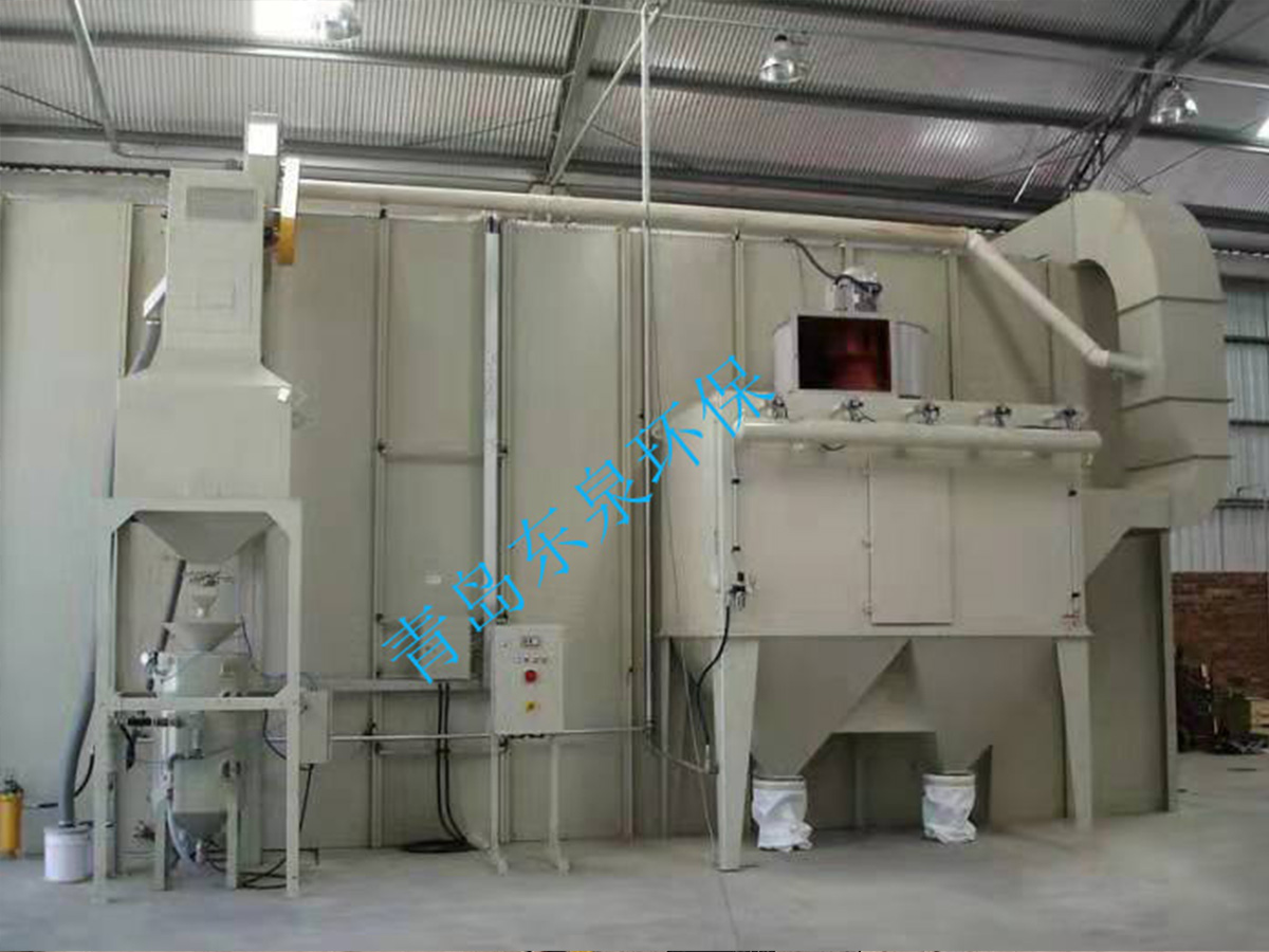 砂料回收、分離及除塵系統(tǒng)的工作原理:噴砂時(shí)砂料掉落到蜂窩漏斗里,再由氣缸帶動(dòng)刮板往復(fù)運(yùn)動(dòng),使落入漏斗內(nèi)的砂料推送到噴砂房一端的螺旋輸送機(jī)里面,通過螺旋輸送機(jī)輸送到皮帶輸送機(jī)內(nèi),皮帶輸送機(jī)等把砂料送入風(fēng)選分離器中,風(fēng)選分離器將砂料分離至儲(chǔ)料斗,從而保持砂料的清潔度和純度,有用的砂料進(jìn)入儲(chǔ)砂罐內(nèi)繼續(xù)循環(huán)使用,粉塵及污物則隨氣流進(jìn)入除塵系統(tǒng)內(nèi),經(jīng)過除塵系統(tǒng)的過濾、干凈空氣排入大氣,粉塵及污物則儲(chǔ)存在粉塵筒中等待定期清理。